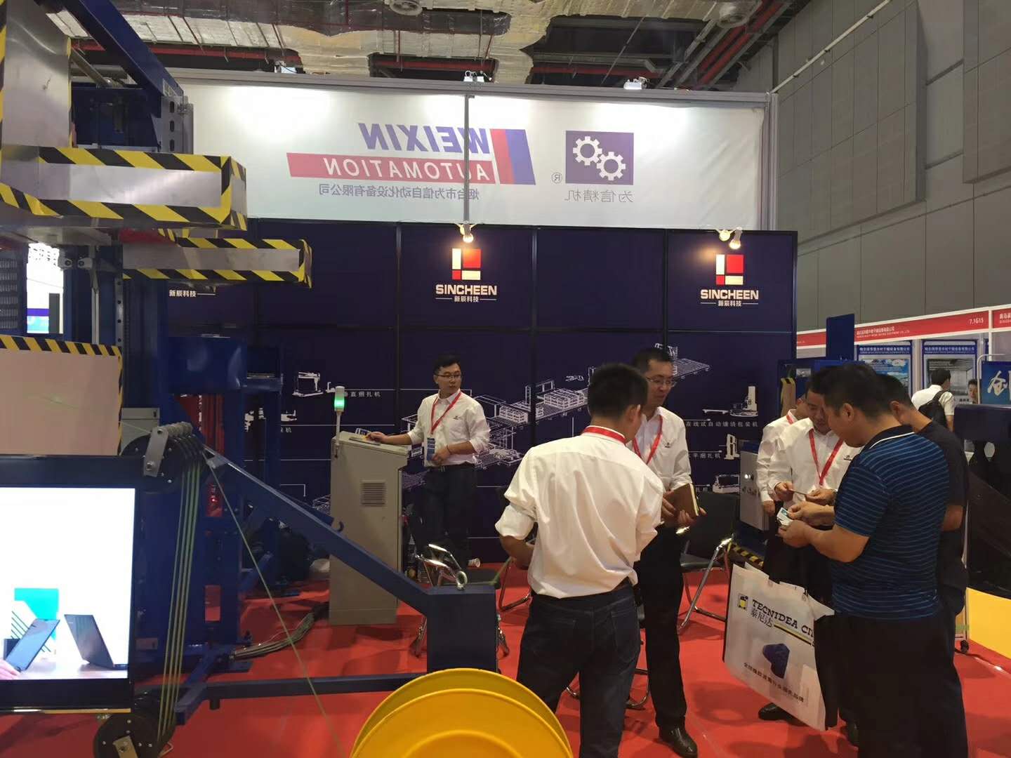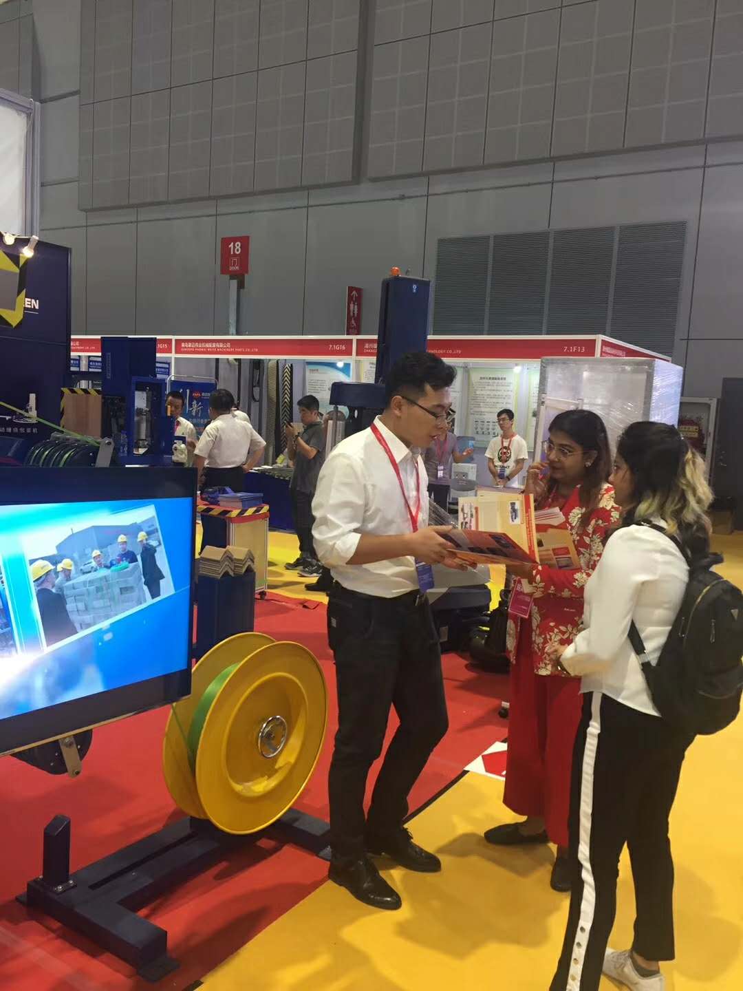 我司于國內率先研發的集自動加護角、墊條、打帶于一體的自動化包裝系統在展會上閃亮登場,展會現場一片繁忙、、、
